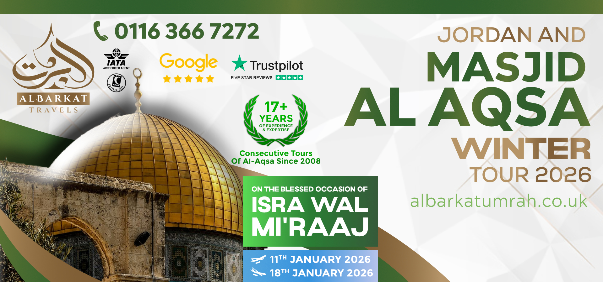 For full details, please see the poster attached in the gallery section for this Masjid Al-Aqsa Tour Masjid Al-Aqsa & Jordan Summer Tour 2026 Embark on a spiritually enriching journey through the historic and sacred lands of Palestine and Jordan. Our Masjid Al-Aqsa & Jordan...