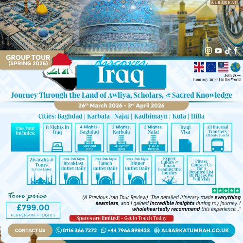 Discover Iraq Tour – Spring 2026 Please see the leaflet in the gallery section for full details (26th March 2026 – 3rd April 2026)Iraq Tour 2026: A Journey Through the Land of Awliya, Scholars & Sacred Knowledge Embark on a spiritually uplifting journey across the...