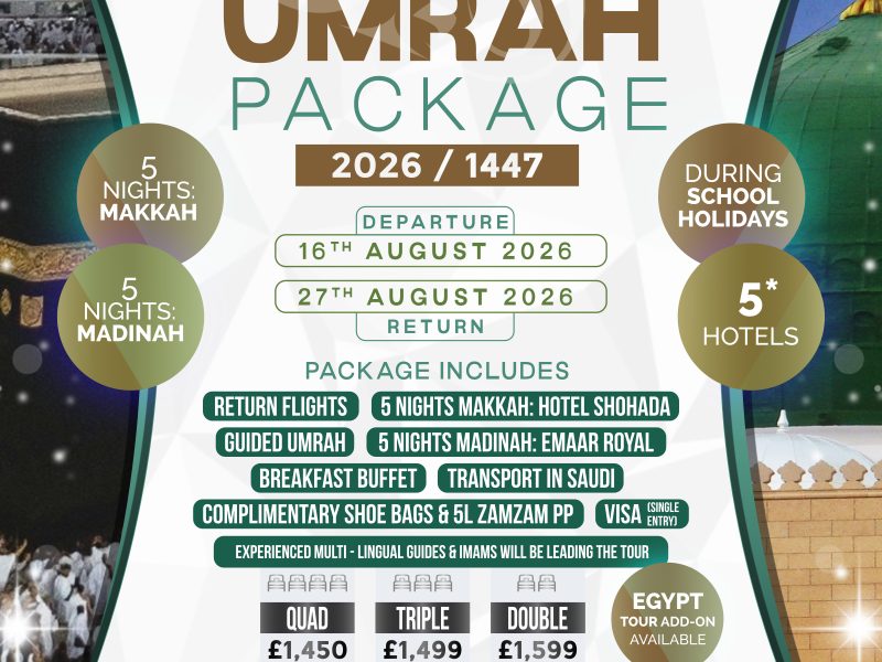Summer Umrah Package 2026 / 1447 A Blessed Journey During School Holidays Please see the leaflet attached in the gallery section for full details Experience the journey of a lifetime with our Summer Umrah Package 2026, specially designed for families, students, and individuals looking to…